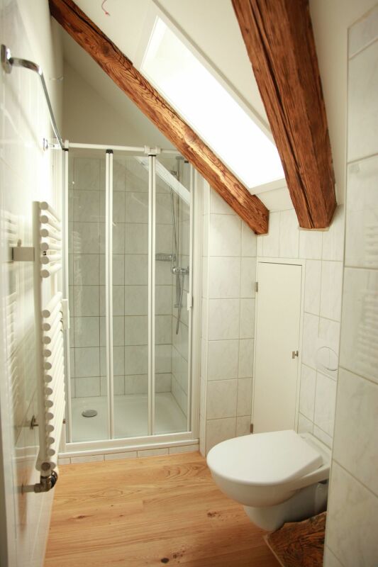 - Nasszelle mit Dusche, Lavabo und WC sowie Dachfenster